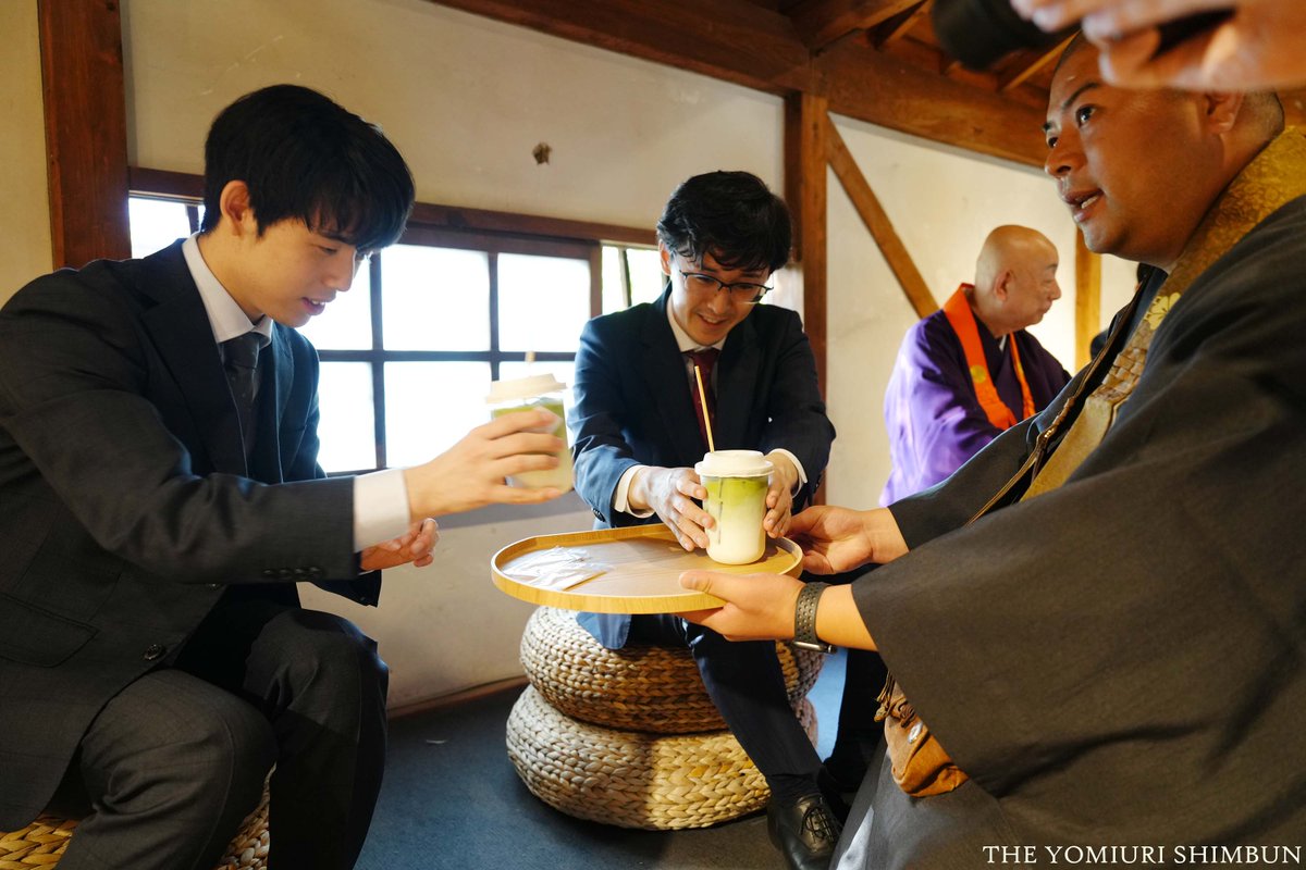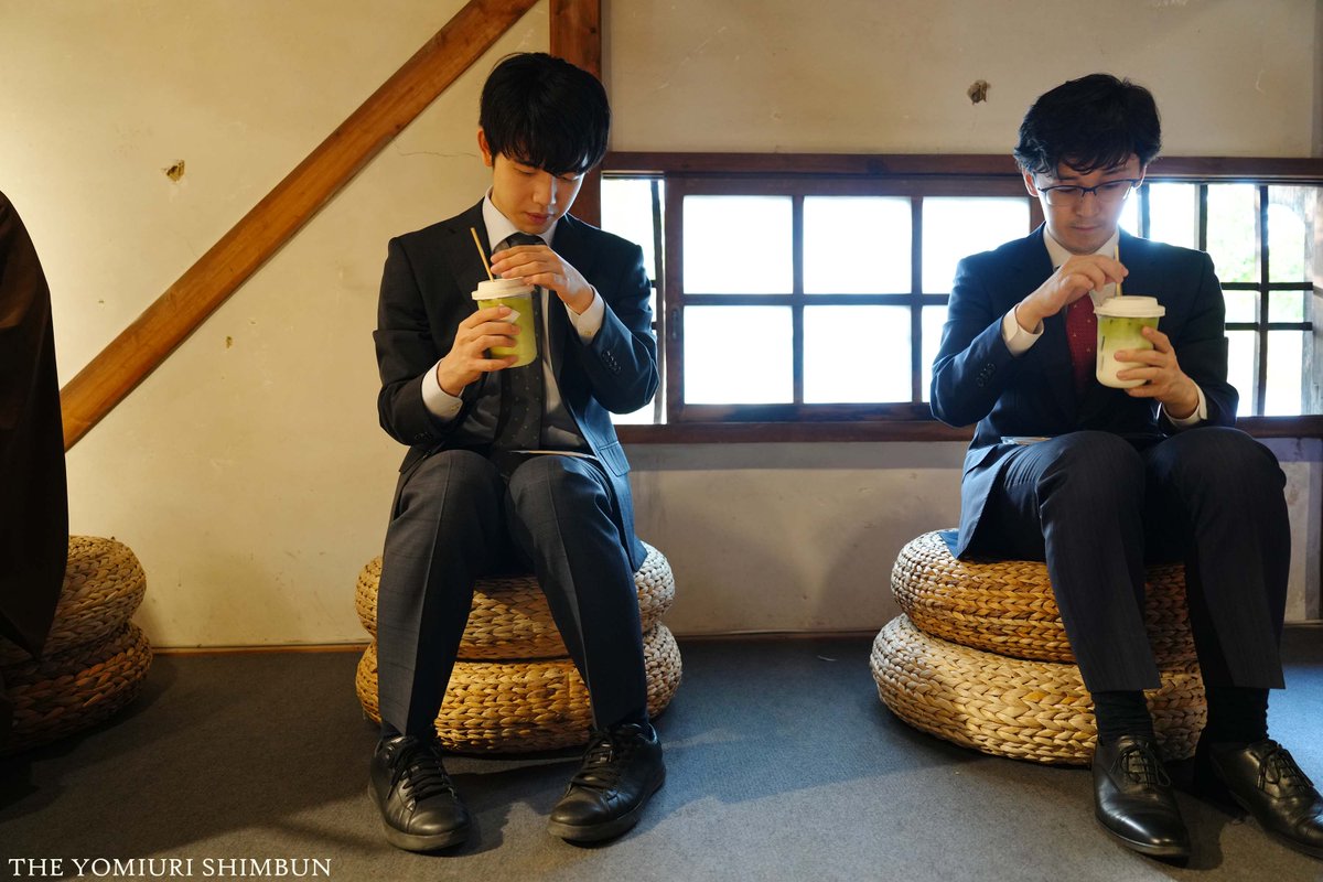 藤井聡太竜王と伊藤匠七段は、広い仁和寺の境内を散策する途中で、蔵を改装したカフェで一息。リラックスした表情で宇治抹茶ラテを楽しみました(若杉)